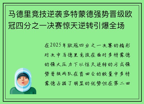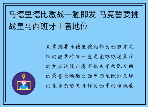 文章摘要:马德里德比,作为西班牙足坛的经...