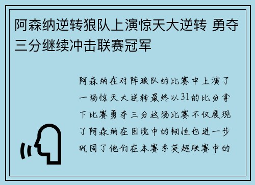 阿森纳在对阵狼队的比赛中上演了一场惊天大...