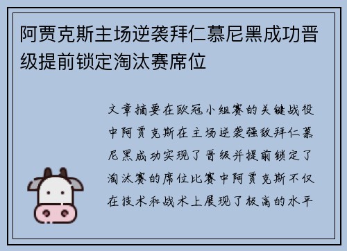 文章摘要:在欧冠小组赛的关键战役中,阿贾...