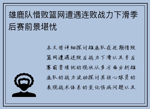 本文将详细探讨雄鹿队在近期惜败篮网,遭遇...